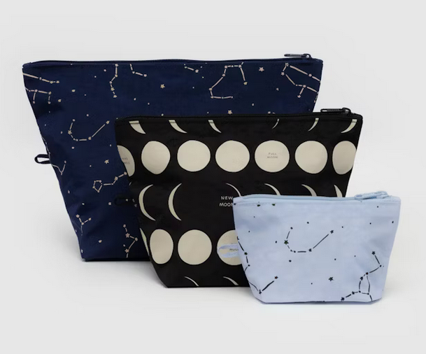A set of three all-purpose zip pouches. Ideal for travel, organization, and storage.