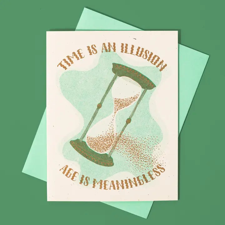 A2 folded card, blank inside Contrast envelope Risograph printed with eco-friendly, vegetable-based ink 100lb, FSC-Certified, 100% recycled paper in an off-white fiber-fleck stock
