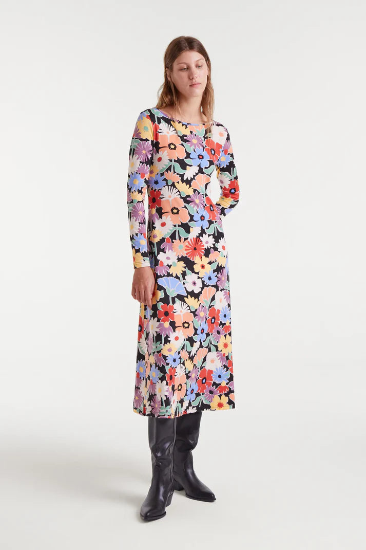 Bring bold florals into your wardrobe with this midi dress. Featuring a bateau neckline, long sleeves, and a side slit, it strikes the perfect balance between elegance and ease.