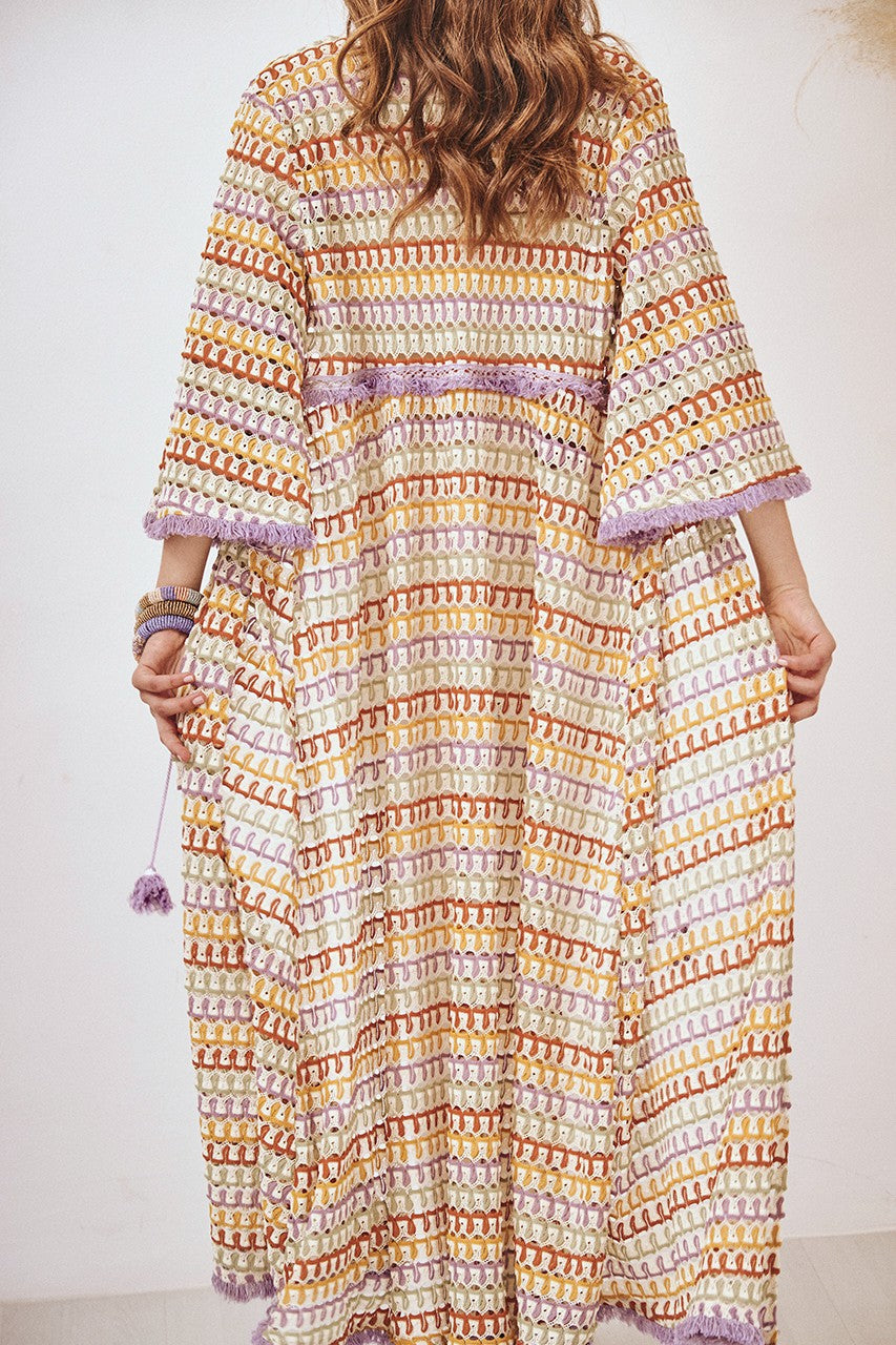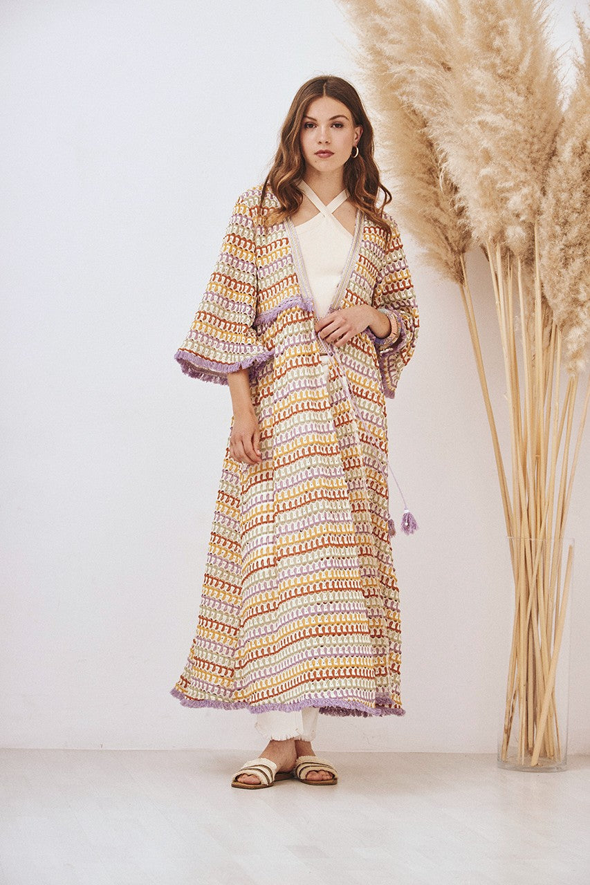 Long knitted jacket/robe with stripes, featuring long sleeves. Tied at the waist, with purple fringe details at the cuffs and waist.