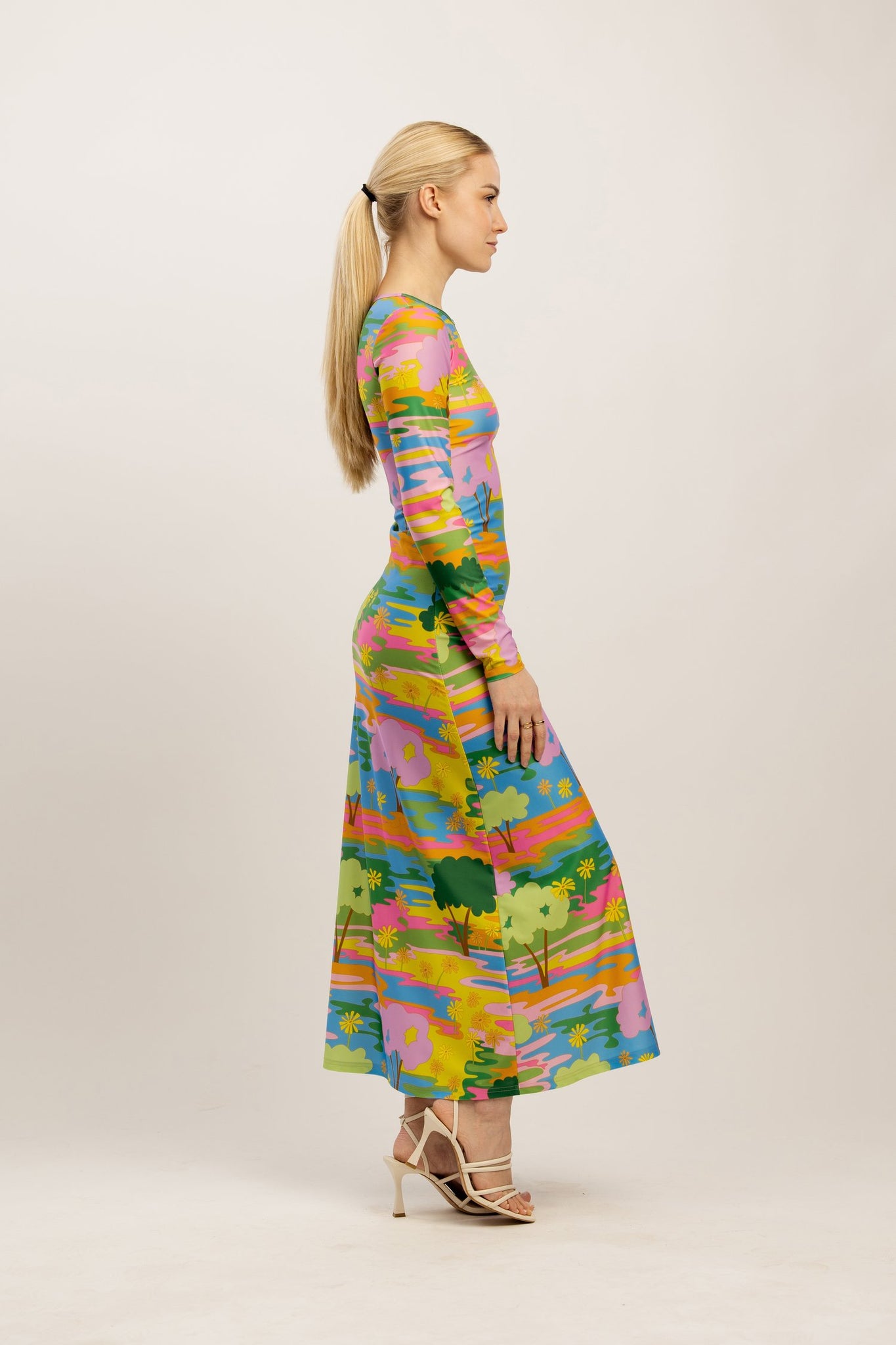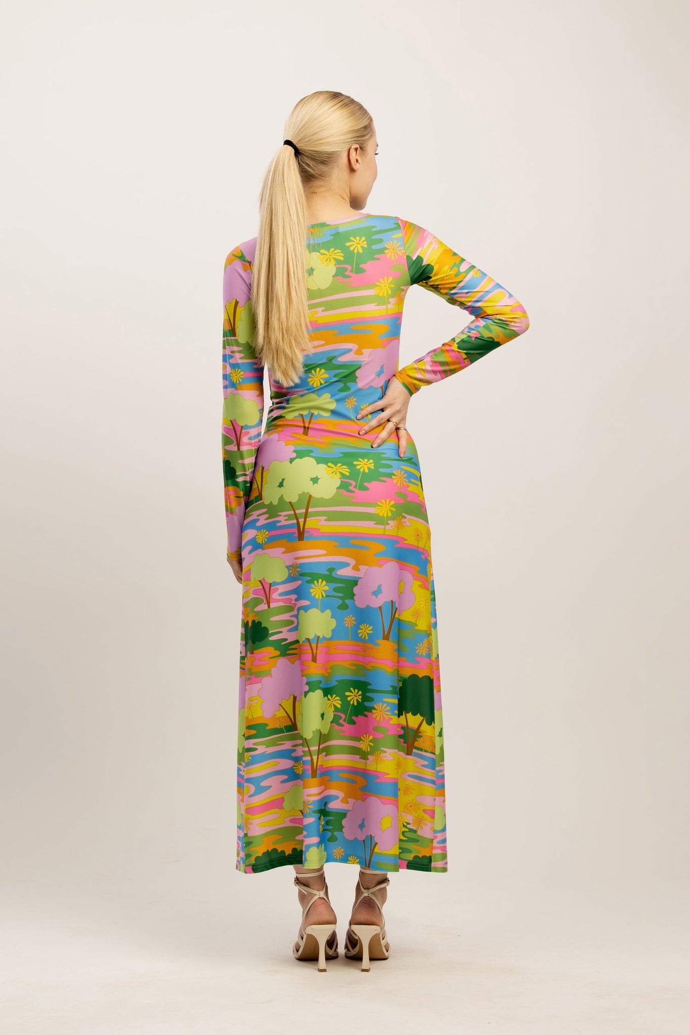 “Penny Lane” long sleeve maxi dress in a print by Alja Horvat. Dress is made from stretchable material, wraps nicely around your body and has a scooped neckline at the front and back.