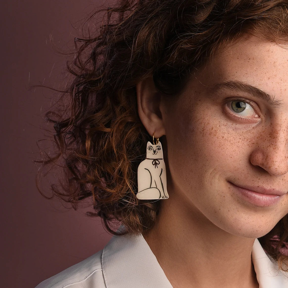cool gift for a cat lady, these Tabby cat earrings are made from white earthenware clay, glazed with non-toxic transparent glaze and embellished with gold or platinum. Each product is handmade and painted, which makes it unique. Suitable for sensitive ears, these Tabby cats come with silver or gold plated silver hoops. We use a lightweight ceramic and they are thin enough to weigh only about 10gr (0.3527oz) and they are painted on both sides, to look nice on short haired ladies.