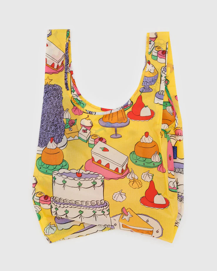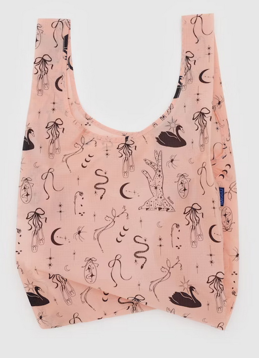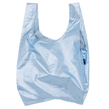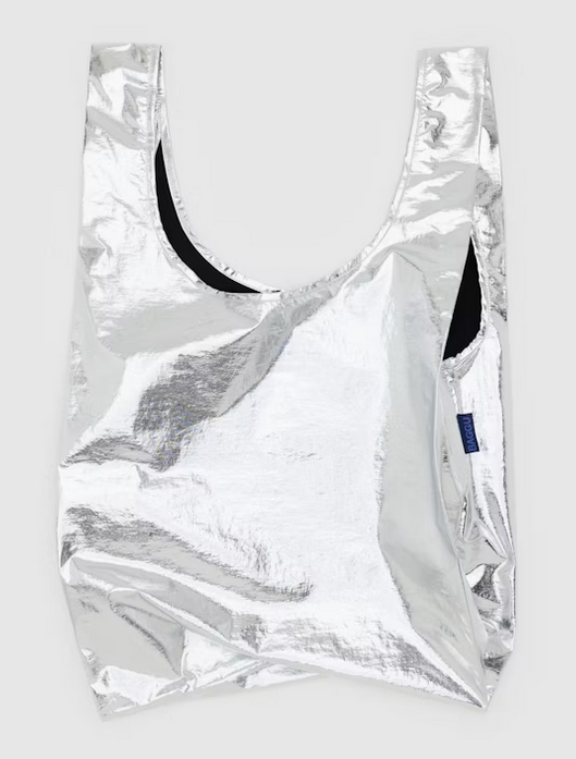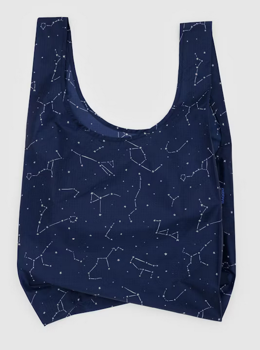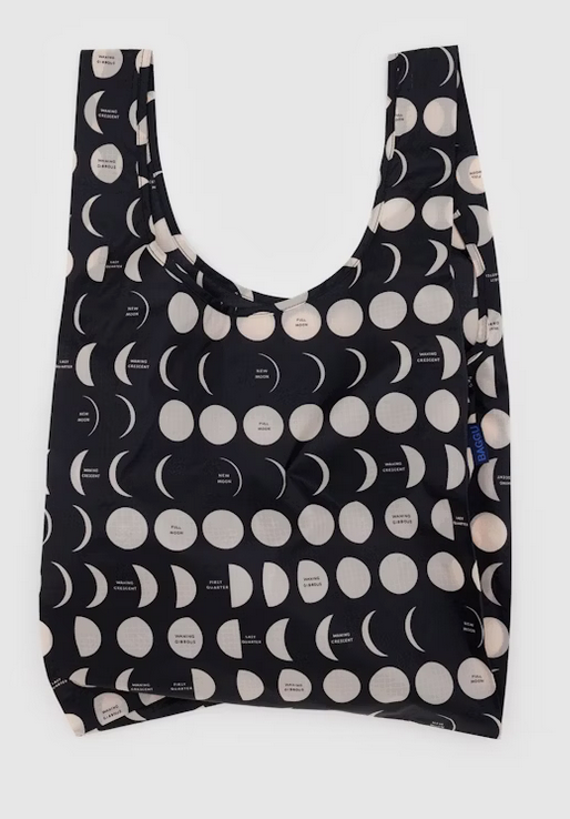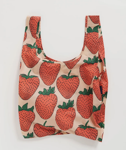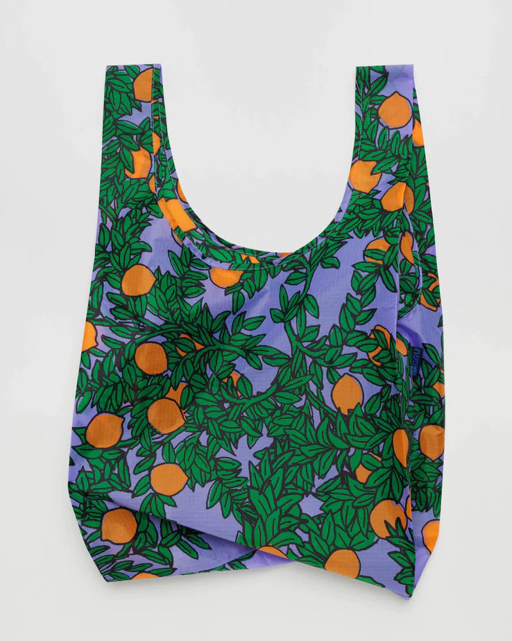 Baggu's best selling reusable bag is not just for the grocery store, it goes everywhere and hauls (practically) anything. Carry in your hand or over your shoulder. Holds 2–3 plastic grocery bags worth of stuff. Folds into a flat 5" × 5" pouch. Holds 50 lbs. Now made from 40% recycled nylon sourced from pre-consumer waste.