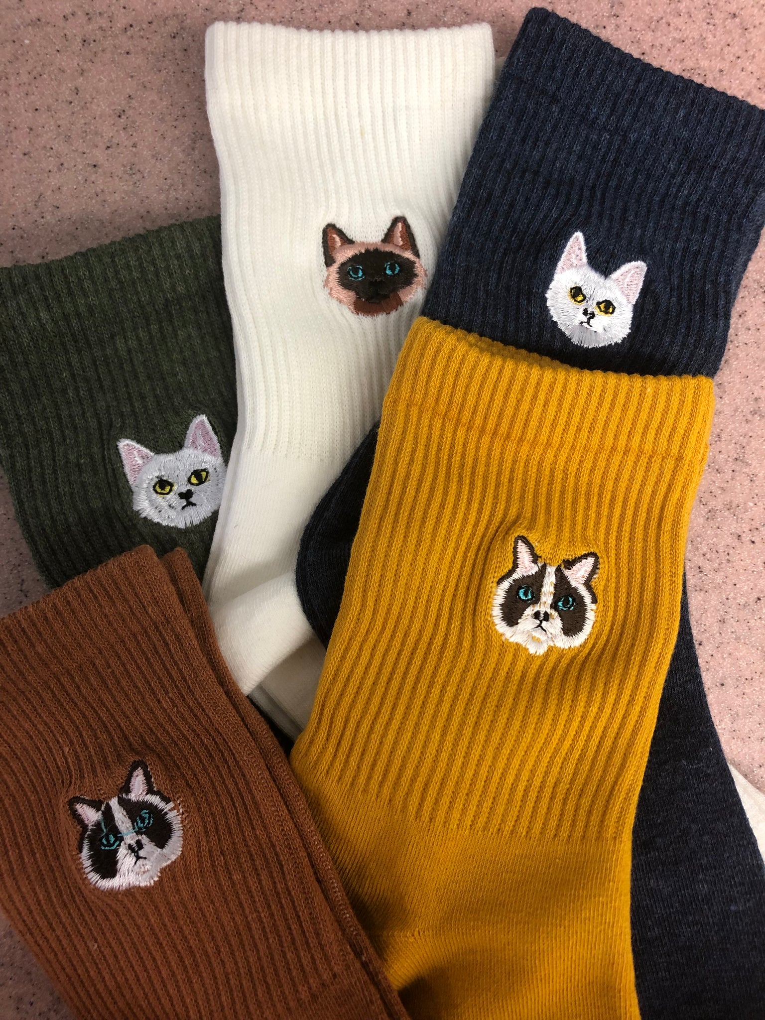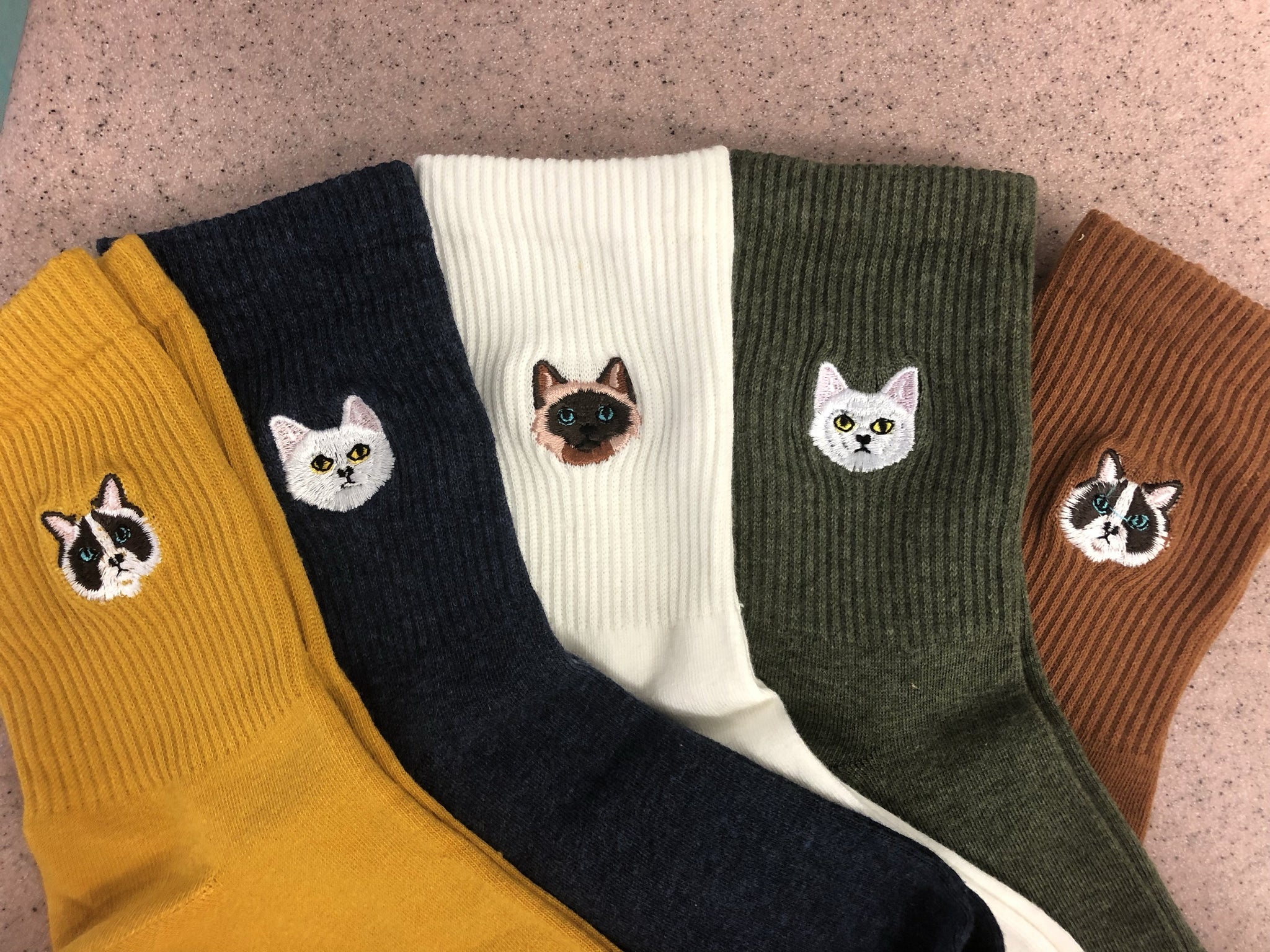 The purrfect set of socks for the cat lover! Fits size 6-10 feet. 100% cotton that’s thick but has a nice stretch! Cats are embroidered onto the socks! Nice height that hits above the ankle. Five pairs of socks.