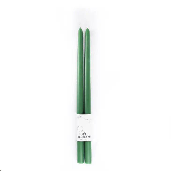 Bluecorn tapers are classic candles dipped into pure molten beeswax at just the right temperature by a steady hand and a keen eye. They are dipped and cooled over twenty times each before a pair can be cut free from the oak rack. When finished and hung, they carry the rich scent of honey and seem to hold light in their bellies. Kept out of drafts and away from fans these tapers will burn virtually dripless for about one hour per inch of length. We recommend stocking up on all the lengths in raw to start, or opting for a single length across a variety of colors. These joined pairs make an awesome display when hung on peg rails or similar! Available in lengths of 10", 12" & 16", these beeswax tapers burn for one hour per inch. Base diameter = 7/8" or 2.2cm