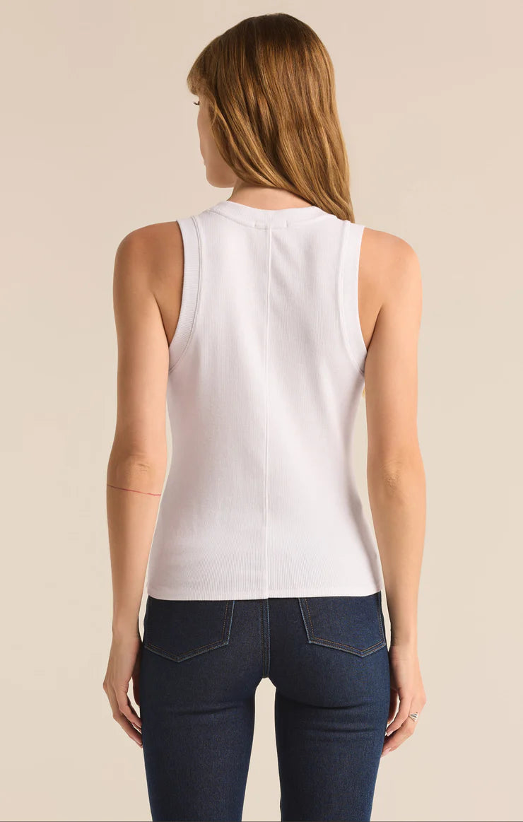 One of our most popular Essential tanks, made of our softly textured feather rib fabric, is a must-have whether worn on its own or as a fitted layer. We love this basic bra-friendly tank tucked or untucked.
