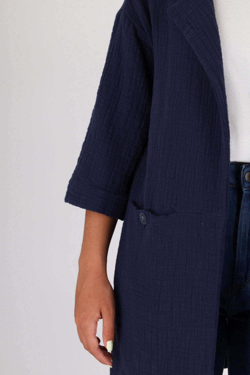 Uros is a navy and tan textured dyed jacket. Designed with a box collar, slim fit and front pockets. Your wardrobe staple for the SS25 season.