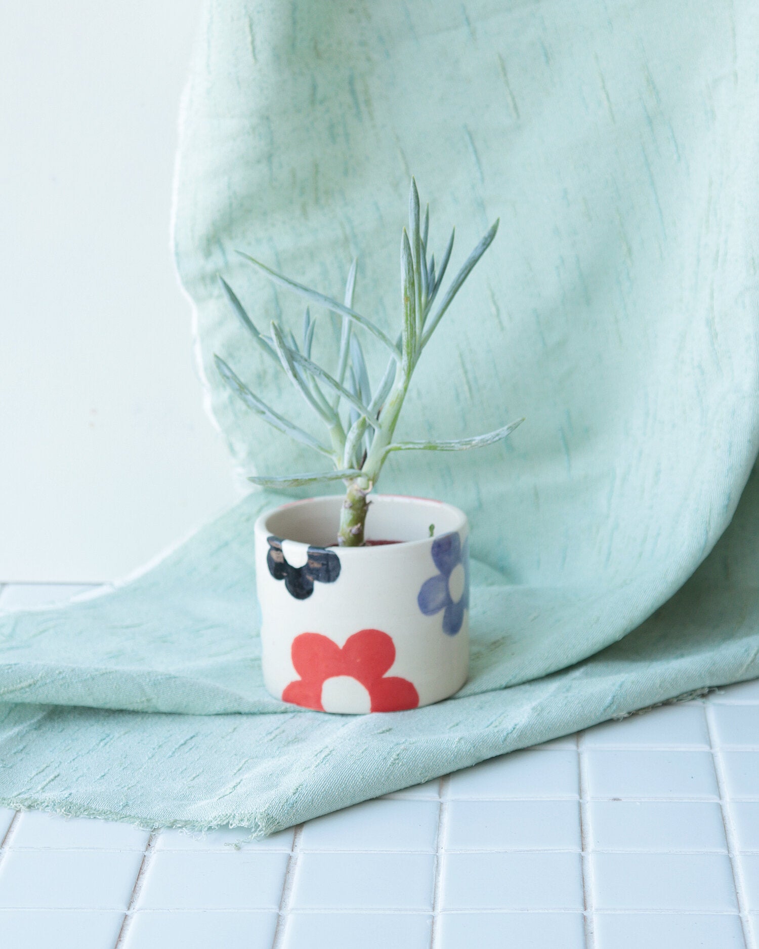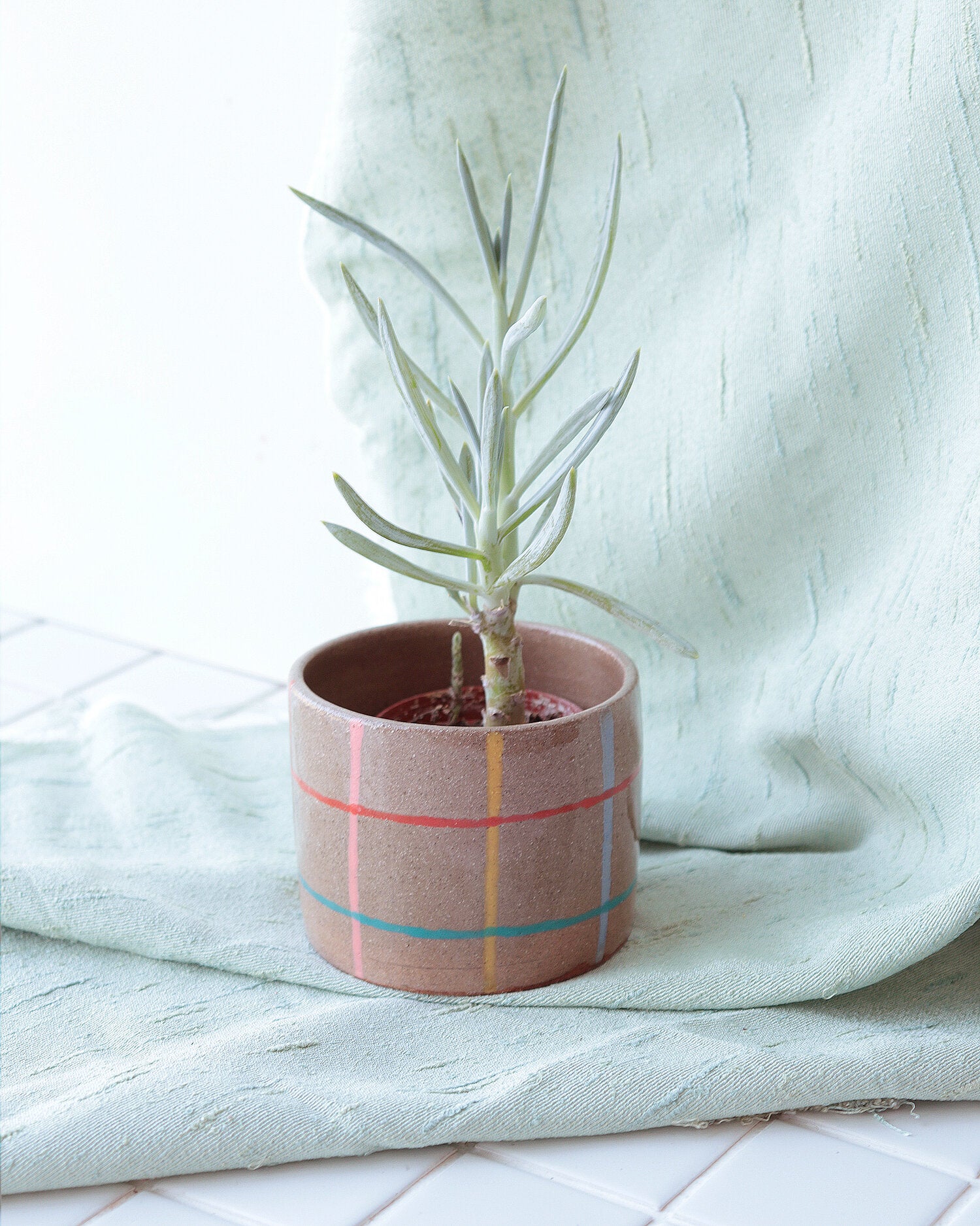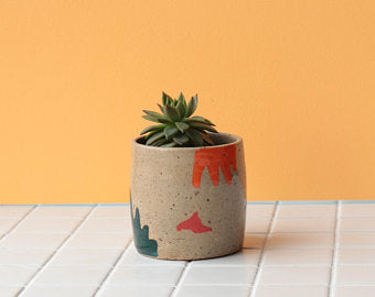 Mini planter perfectly sized for a small succulent or cactus. Hand carved details combined with vivid, colourful glazing. Drainage hole on bottom of vessel. Made in Toronto by Nightshift Ceramics. Approx 3" height x 3” diameter.