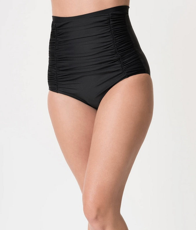 A retro-inspired bikini bottom by Unique Vintage. High-waisted with a bit of shirring for a classic look. We've had lots of customers fall in love with these for their flattering fit. Fit notes: size chart is accurate, however if you have thicker thighs- you may find them a bit snug on the leg and we would suggest maybe sizing up!
