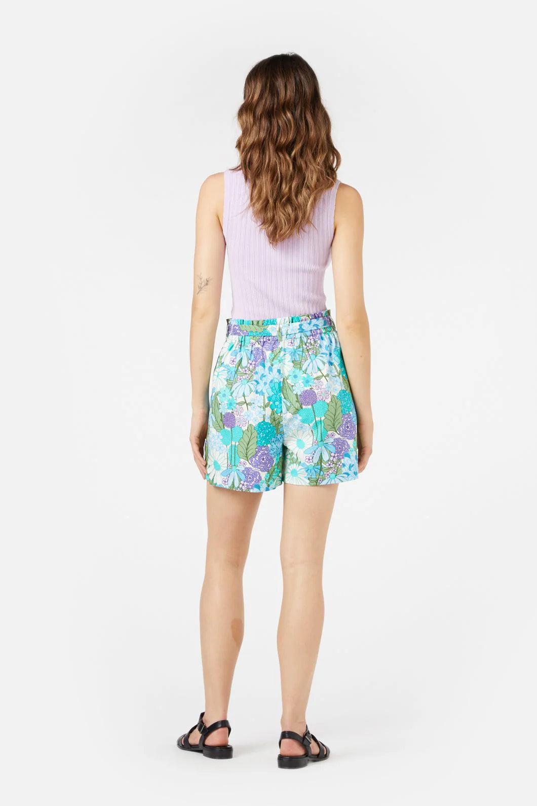 Vibrant blue 60's variety floral printed cotton shorts. A high waisted summer short with wide cut legs & handy pockets