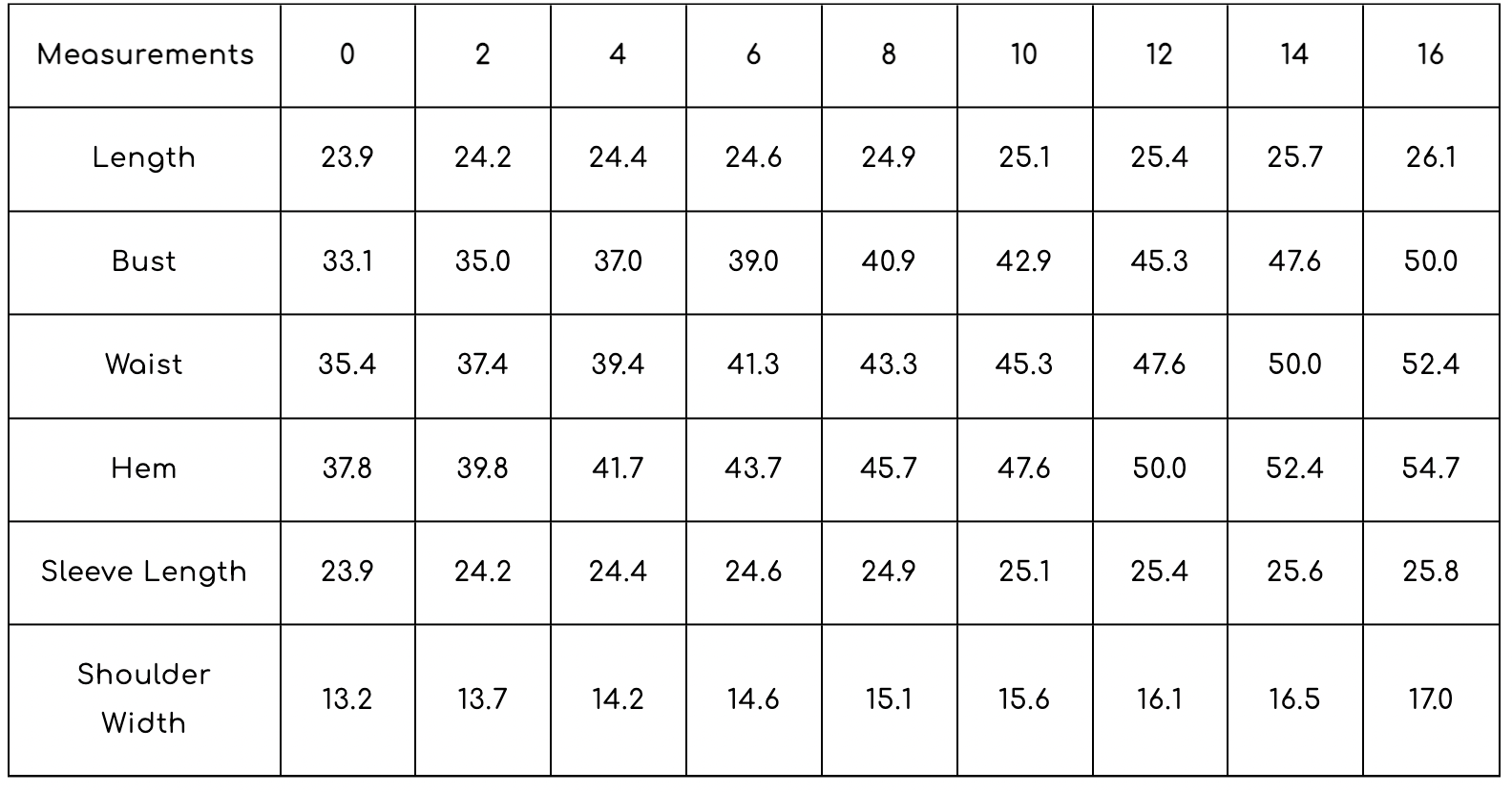 Australian Size Chart: