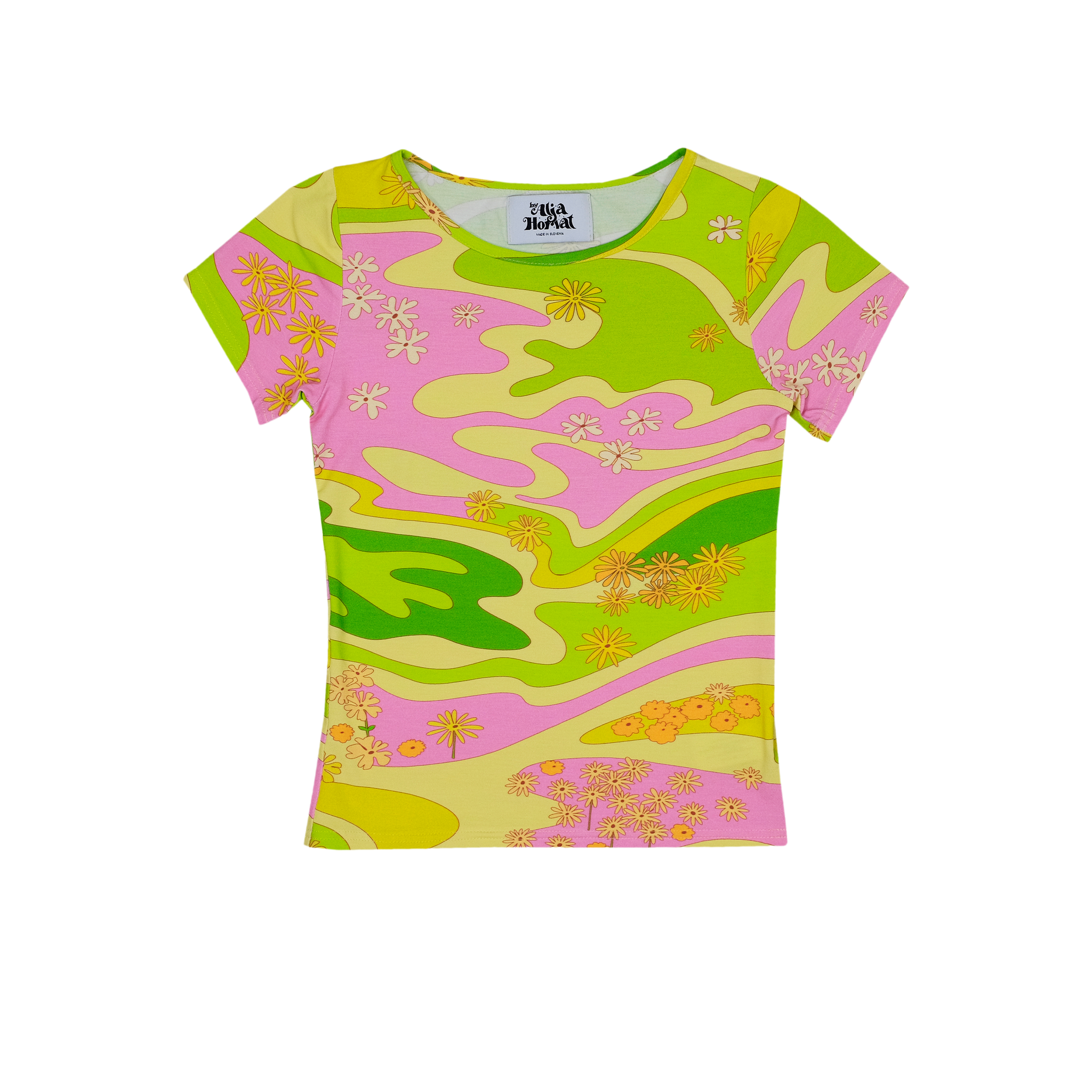 “Lola” second skin short sleeve top in an art nouveau inspired print by Alja Horvat. It’s made from stretchable viscose fabric that is light and “grips” your body.